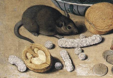 An obliging mouse poses whilst sniffing a ragged comfit, 17th century. Still life by Georg Flegel (1566-1638), detail; full painting at the top of the post. Image Public domain.