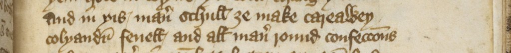 ‘and in þis maner schull ȝe make careawaey colyaundre fenell and all maner round confecciouns’ (‘and in this way shall you make carraway, coriander, fennel and all kinds of round confections’). London, British Library, MS Harley 2378 (early 15th century), folio 156r, detail. © The British Library Board.