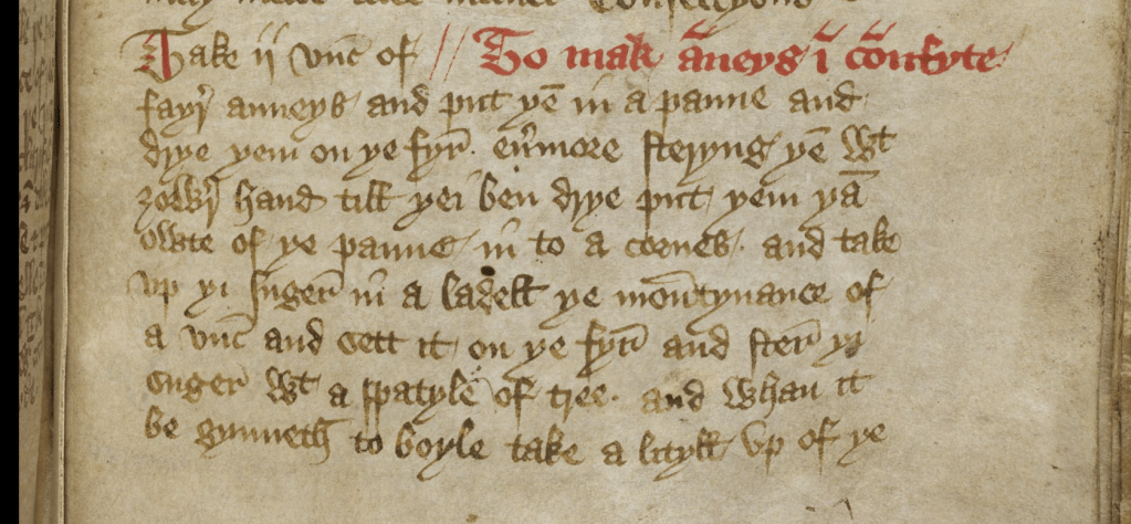 In red ink so we don’t miss it: ‘To mak anneys in counfyte’. London, British Library, MS Harley 2378 (early 15th century), folio 155r, detail. © The British Library Board.