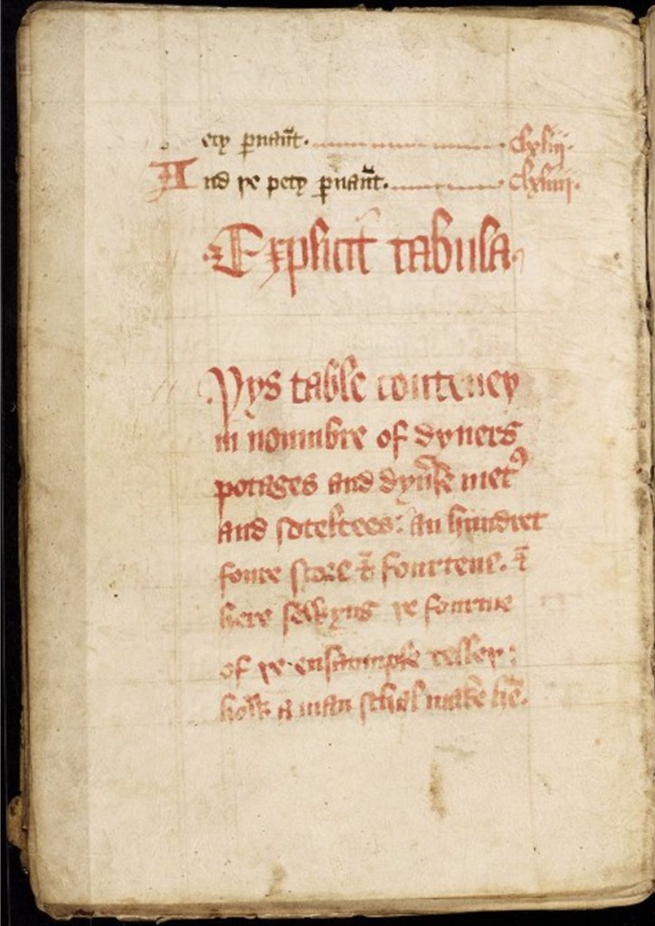 This table contains in number, of diverse potages and diverse dishes and subtleties, one hundred four score and fourteen. And, here, following, the method of each sample recipe explains how a man shall make them.