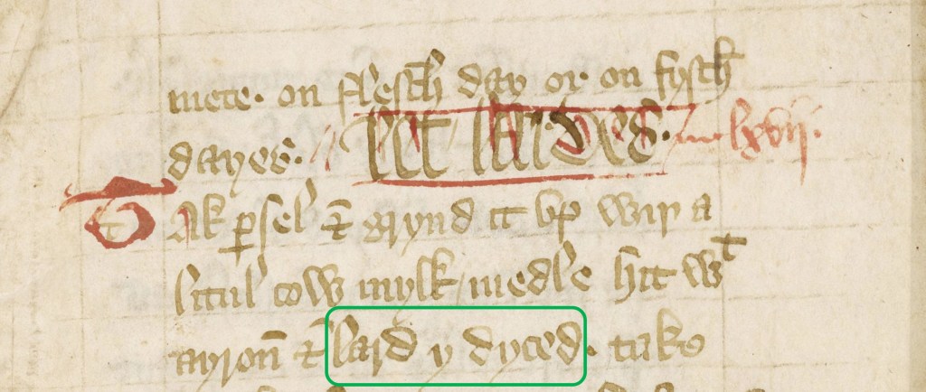 Let lardes, from the digital facsimile of Forme of Cury, Manchester John Rylands Library, MS English 7, f. 37r; detail showing, in green highlight, the words ‘lard ydyced’. Image by permission of the University of Manchester. Highlighting my own. Click on image to go to the source.