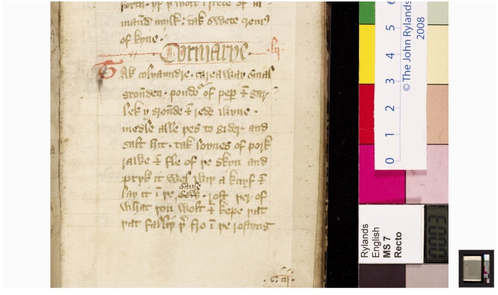 Image: Manchester, John Rylands Library, English MS 7, folio 31 recto, by permission of the University of Manchester. The image is a screenshot from the Rylands website. The recipe is for Cormarye, marinated and roasted pork loins.