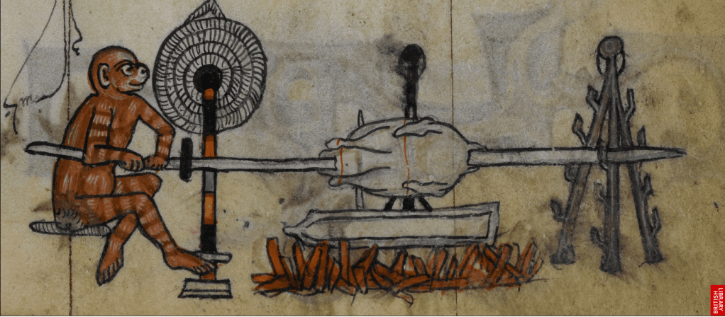 This detail shows a monkey turning a wooden spit, roasting a large bird, under which lies a dripping tray. The latter detail indicates, despite the awkward perspective, that the bird is being roasted before, not above, the fire. Since it would not make sense to sit the dripping tray on the fire, but to the front of it, it follows that the bird would also be roasted in front of it, so that its fat could be collected in the dripping tray. Moreover, as Brears (p. 306) explains, ‘No sane person would wish to burn good joints, or coat them in soot and ash thrown up by driping fat.’