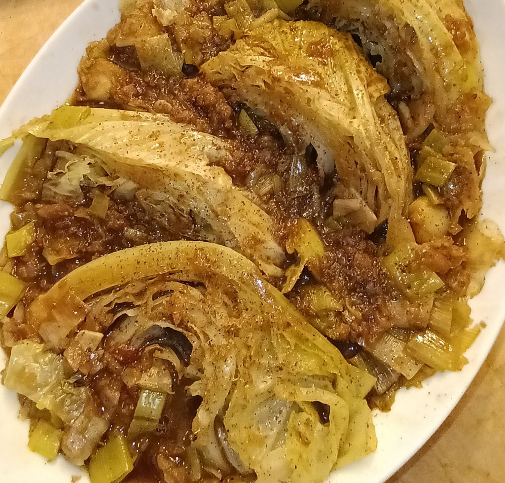 Take cabbages and quarter them and simmer them in good broth with minced onions and the white of leeks, sliced and cut small; and add to this saffron and salt and season it with powder douce. (My own translation.)