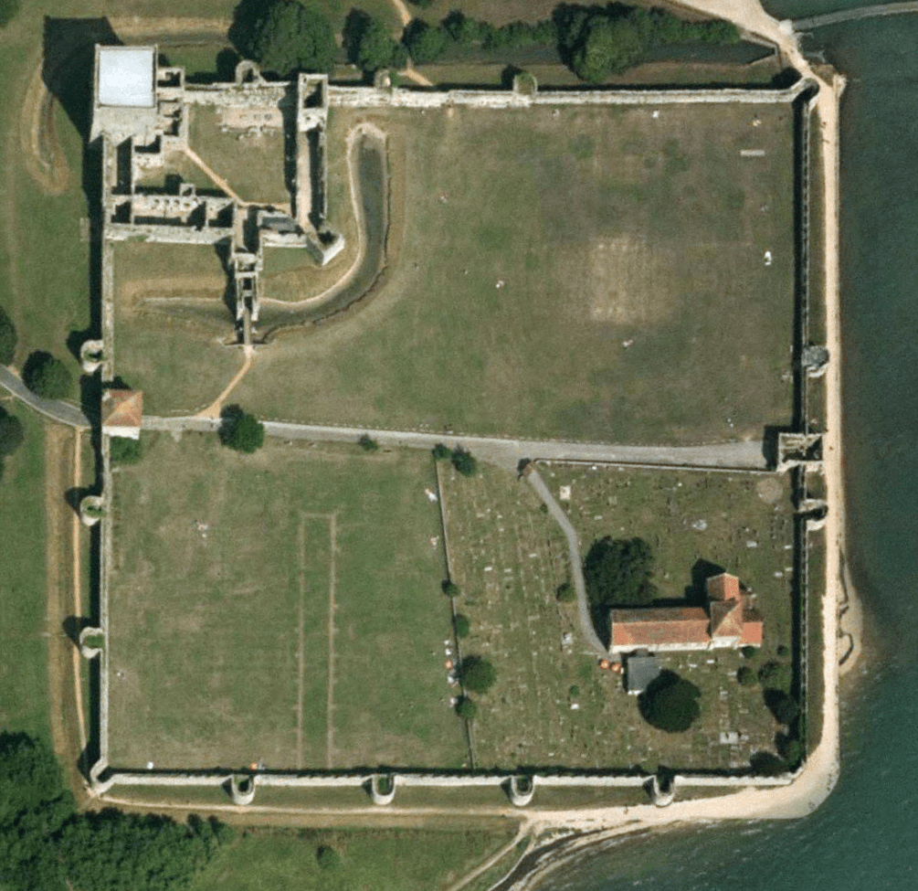 Potchester Castle, aerial shot. The inner bailey, in which Richard II’s palace lodgings are situated, is the small walled rectangle in the top left corner. (Hampshire Hub and University of Southampton via Wikimedia)