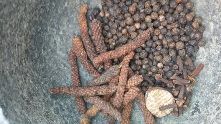 The spices in my Powder Fort, from left, clockwise: long peppers, black pepper corns, whole cloves, nutmeg. Picture by Christopher Monk.