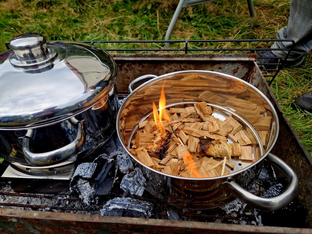 You will need a barbeque; charcoal (lump wood); natural lighters; wood chips (I used oak).