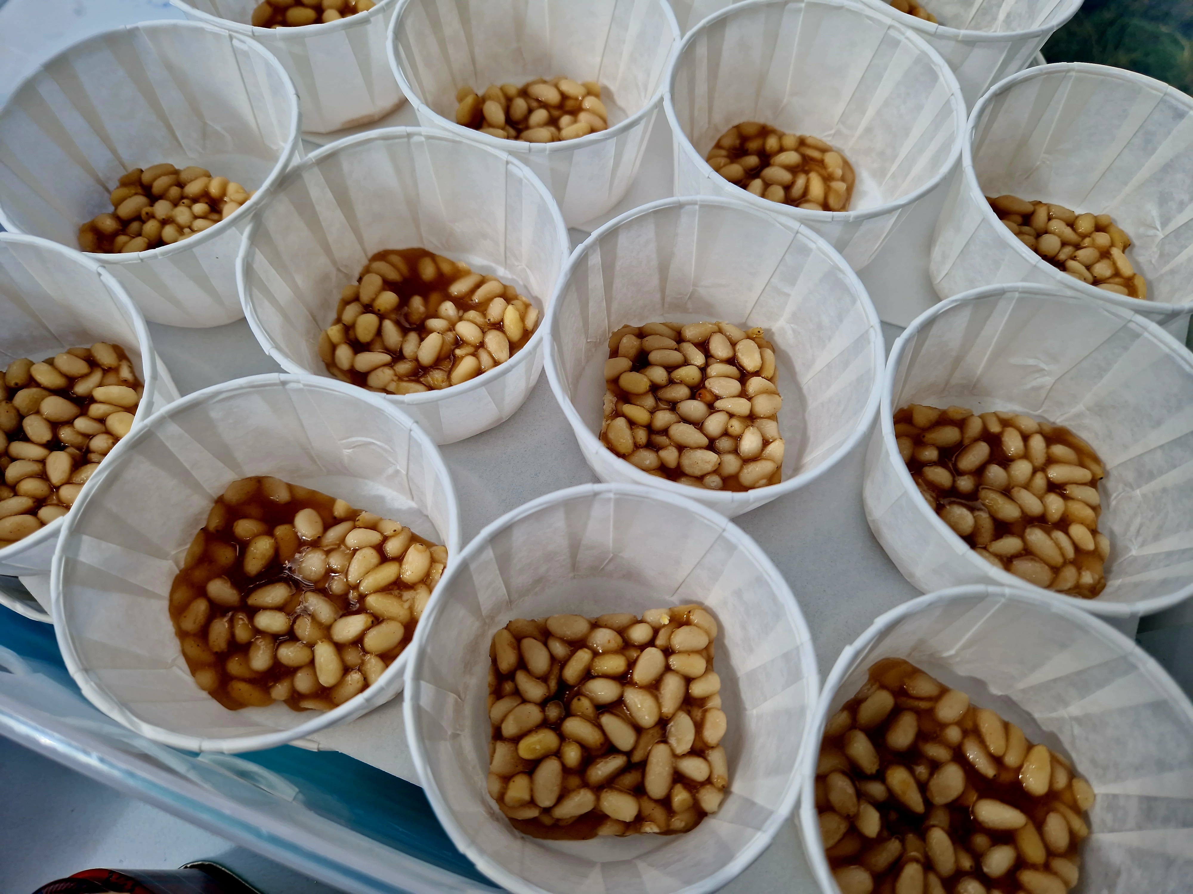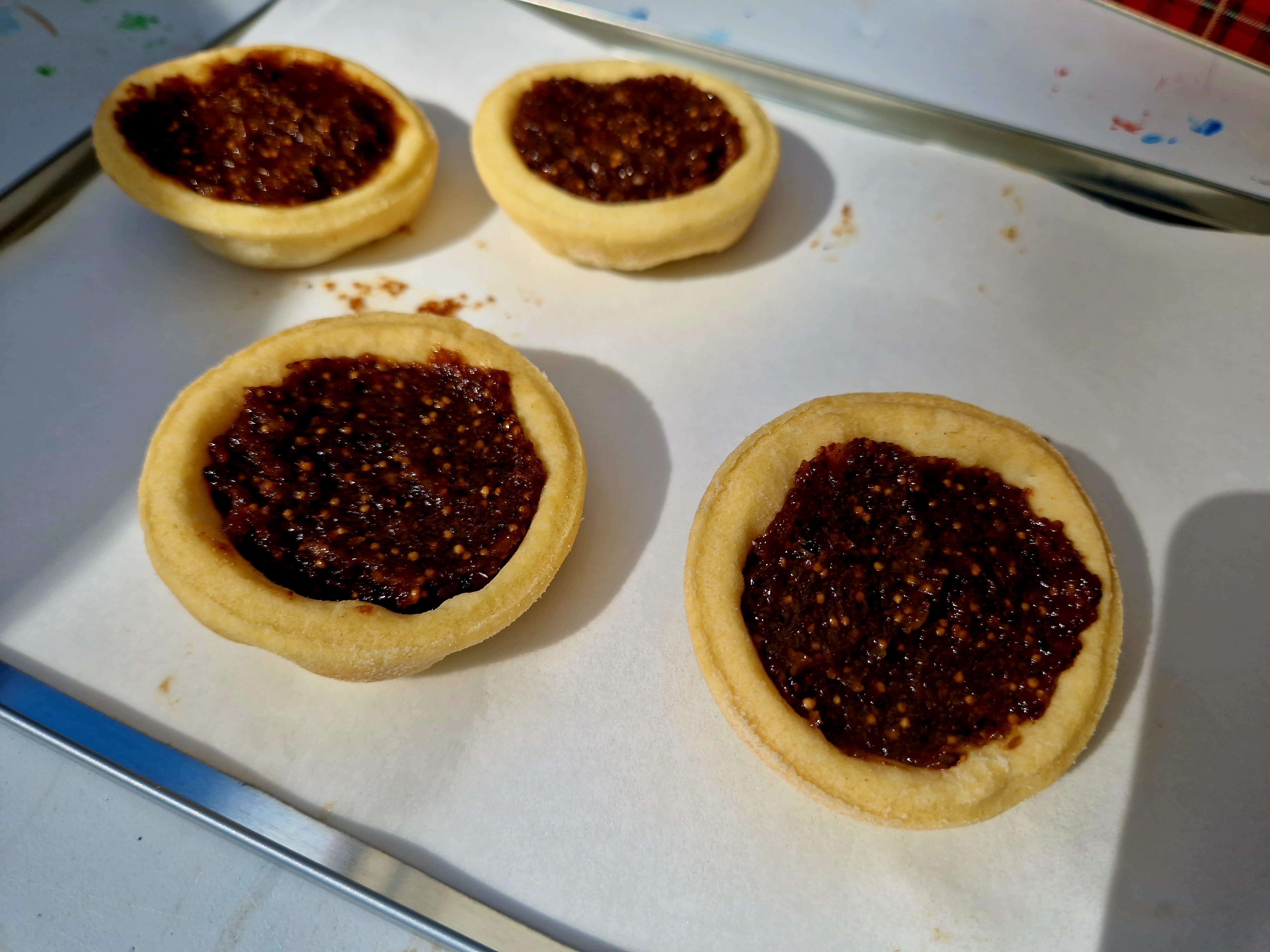 I also pre-made two medieval sweet treats, Payne Ragoun, or Queenly Bread, a pine nut toffee; and tarts filled with Potage Ryall, rather reminiscent in flavour of modern fig rolls โ€“ โ€˜but much betterโ€™, as one kind food sampler put it.