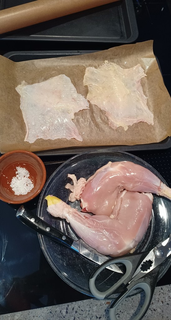 Note: As I decided to make crispy chicken skin for a modern twist, I first skinned the chicken legs. You don’t have to do this. And getting the skin to crisp isn’t as easy as TV chefs make out! If you do want to do this, I advise preparing your skin ahead of time. More on this at the end of the post.