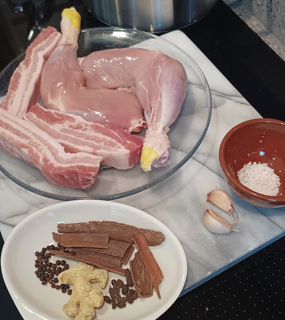 First, poach the pork belly strips. The pork takes longer to cook than the chicken, so it goes in earlier. Bring the pan to boiling point, then reduce the heat to low so that you have a very gentle simmer. Cover with a lid. If you have a glass-lidded pan, it’s easier to keep an eye on it so that it doesn’t boil rapidly. This is a gentle poaching.