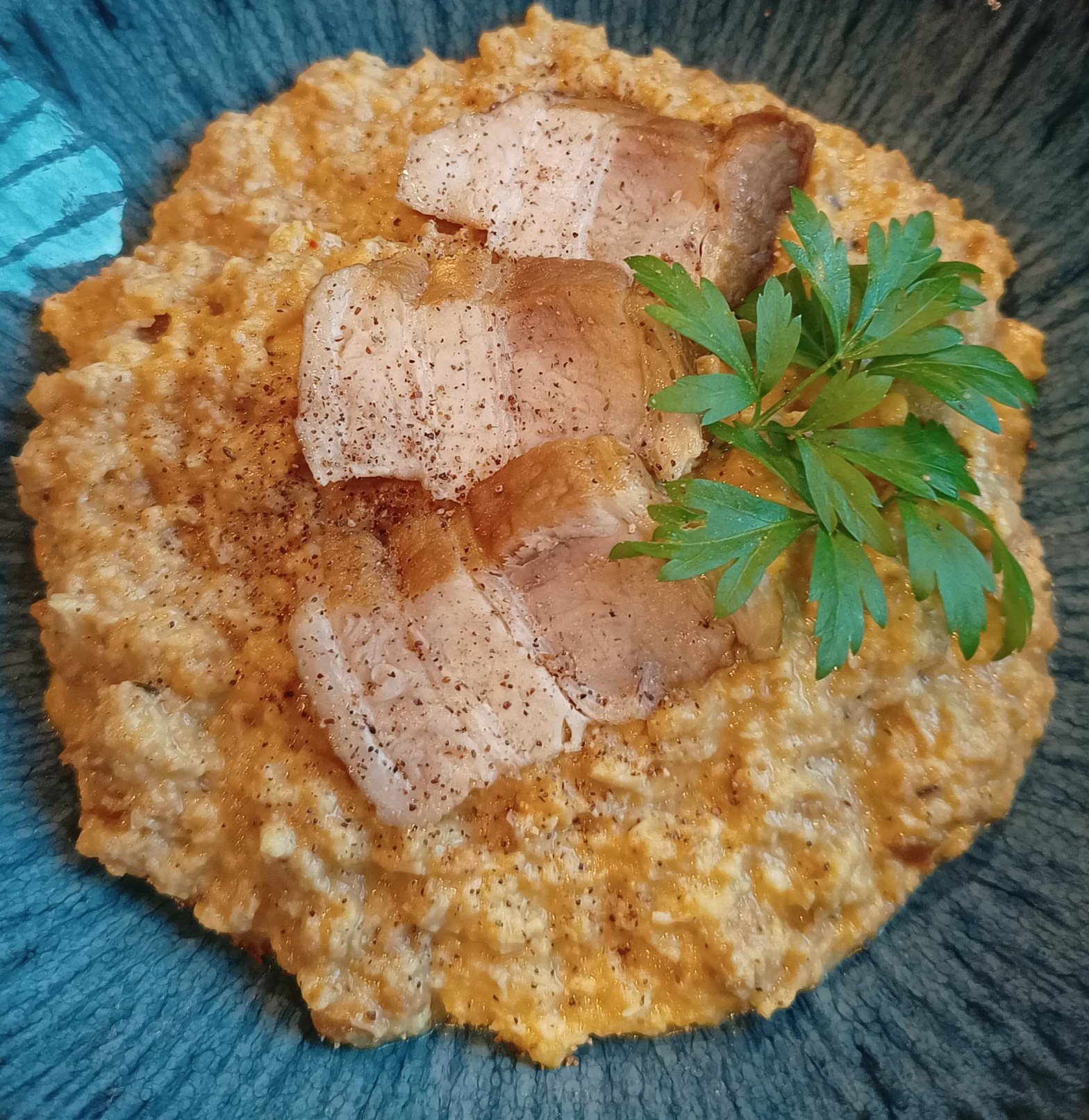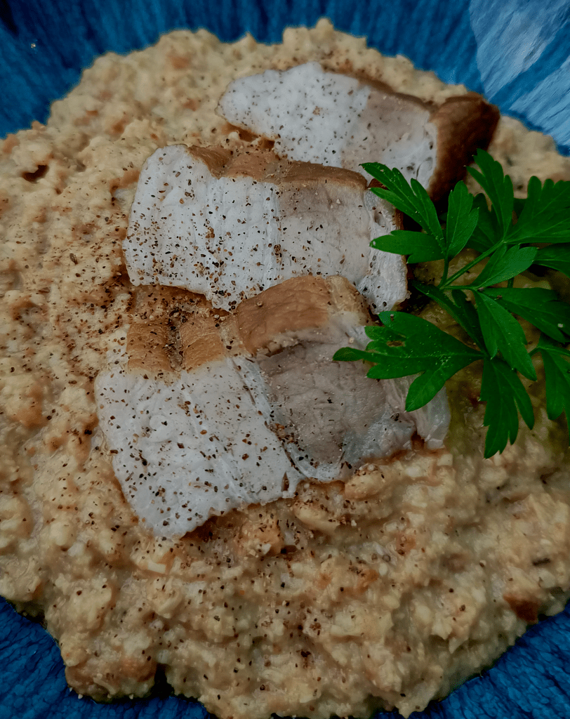 Serve up your Mortrews in warmed bowls. Slice at an angle the reserved piece of belly pork so that you have a few slices to place atop of each bowlful. A little parsley as garnish adds some needed colour.