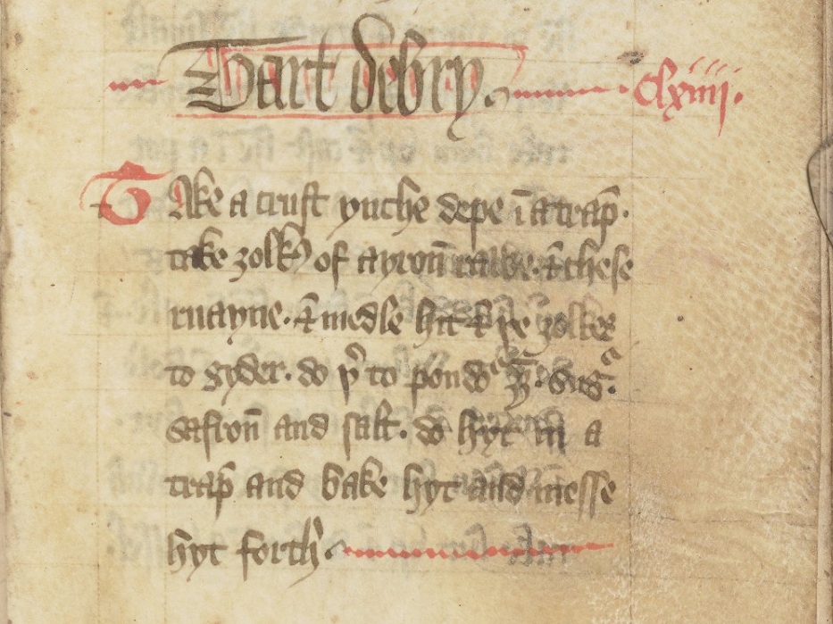 Tart de bry, Fourme of Cury. John Rylands Library, MS English 7, folio 77r.