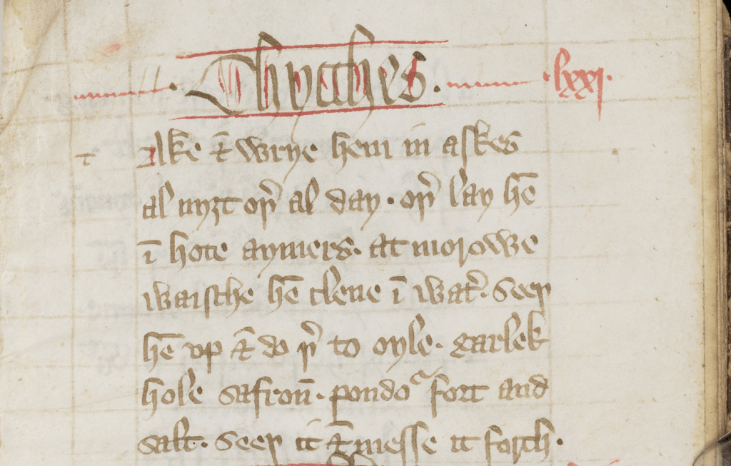 Featured image: Chycches, from Fourme of Cury, Manchester John Rylands Library, English MS 7, folio 40r, cropped.
