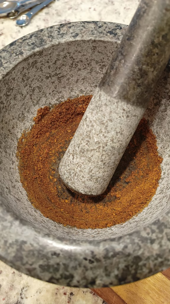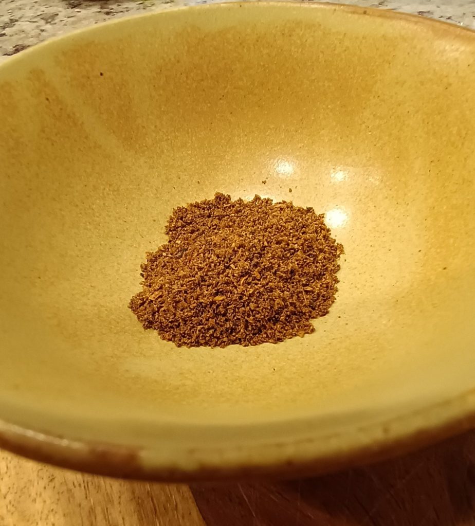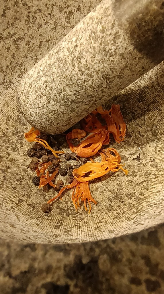 Grind the mace and cubebs with a pestle and mortar. This should yield about 2 teaspoons of ground spice mix. I didn’t use all of this.