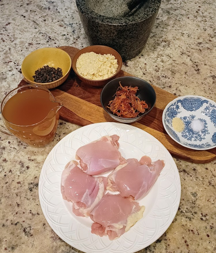 And, so, to my own version of the earliest of the recipes, which I’m calling Chicken in Gravy. I’ve only cooked this once, so what you read here is a breakdown of my first experiment. Both Ray and I really enjoyed it, and I will continue to refine it. It is a delicious, aromatic dish, really quite different from other medieval chicken dishes I’ve cooked.